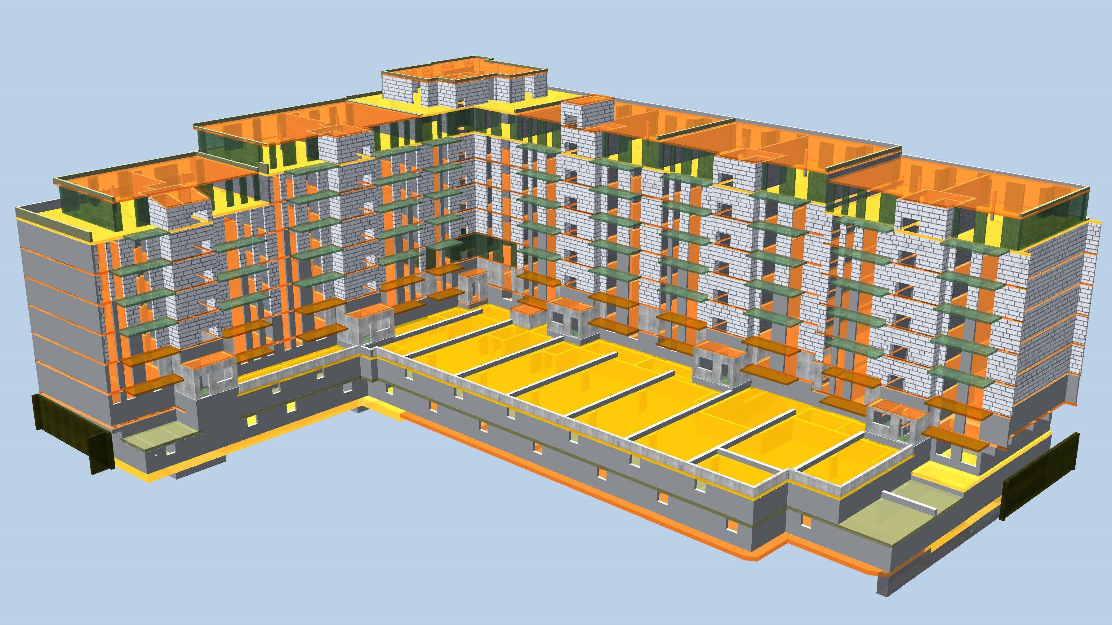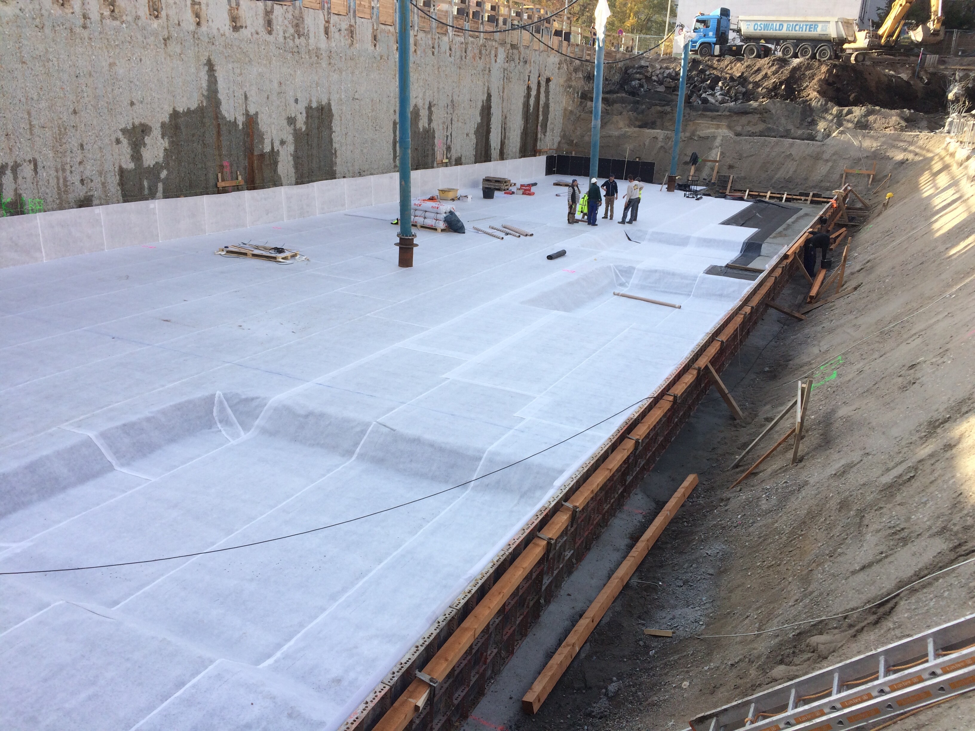 Besondere Anforderungen stellte das anstehende Grundwasser dar: Die Untergeschosse wurden als wasserdichte WU-Konstruktion ausgeführt, ergänzt durch eine Frischbetonverbundfolie unter der Bodenplatte und an den Außenwänden. Während die überbauten Gebäudeteile durch ihr Eigengewicht auftriebssicher sind, wurde die Tiefgarage im nicht überbauten Innenhof mit Bohrpfählen im Baugrund verankert. Im Erdgeschoss ermöglichen wandartige Stahlbetonträger die Überbrückung der Fahrgassen.