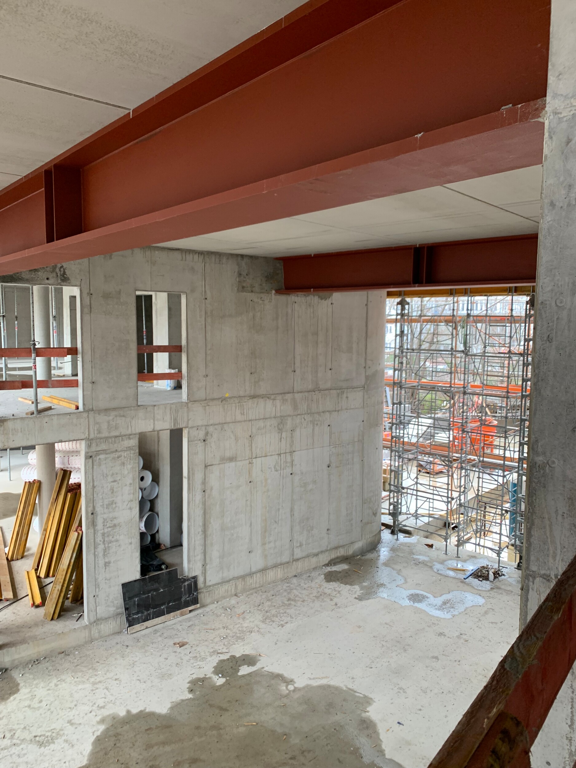 Die Tragwerksplanung basiert auf einer wirtschaftlichen Stahlbetonskelettbauweise, die flexible Grundrisse ohne Eingriffe in die Tragkonstruktion ermöglicht. Großzügige Durchgänge wurden mit leistungsfähigen Stahlbetonverbundträgern überspannt. Die gebettete Bodenplatte sorgt für eine sichere Lastverteilung und minimiert Setzungsunterschiede im schwierigen Baugrund.