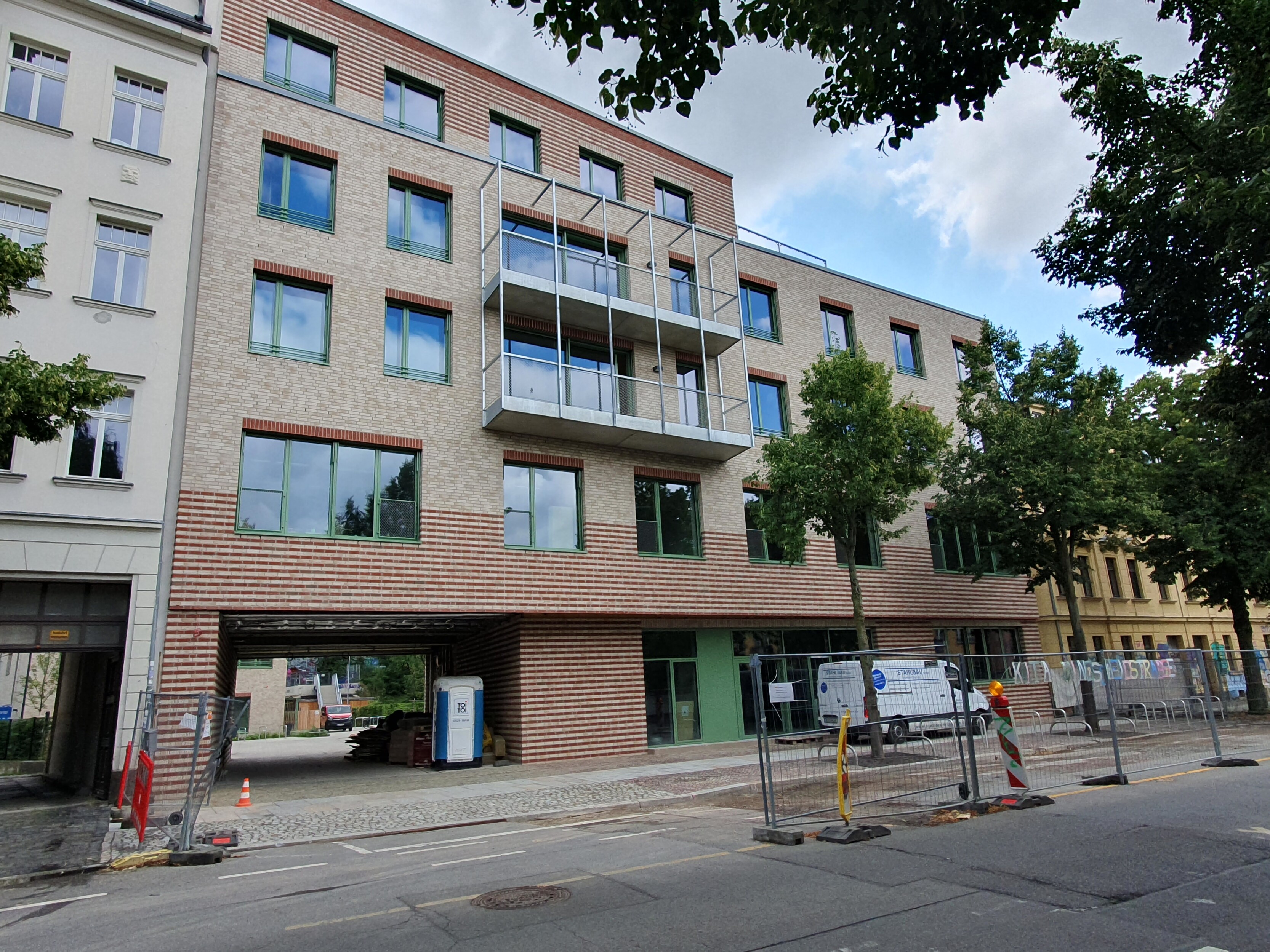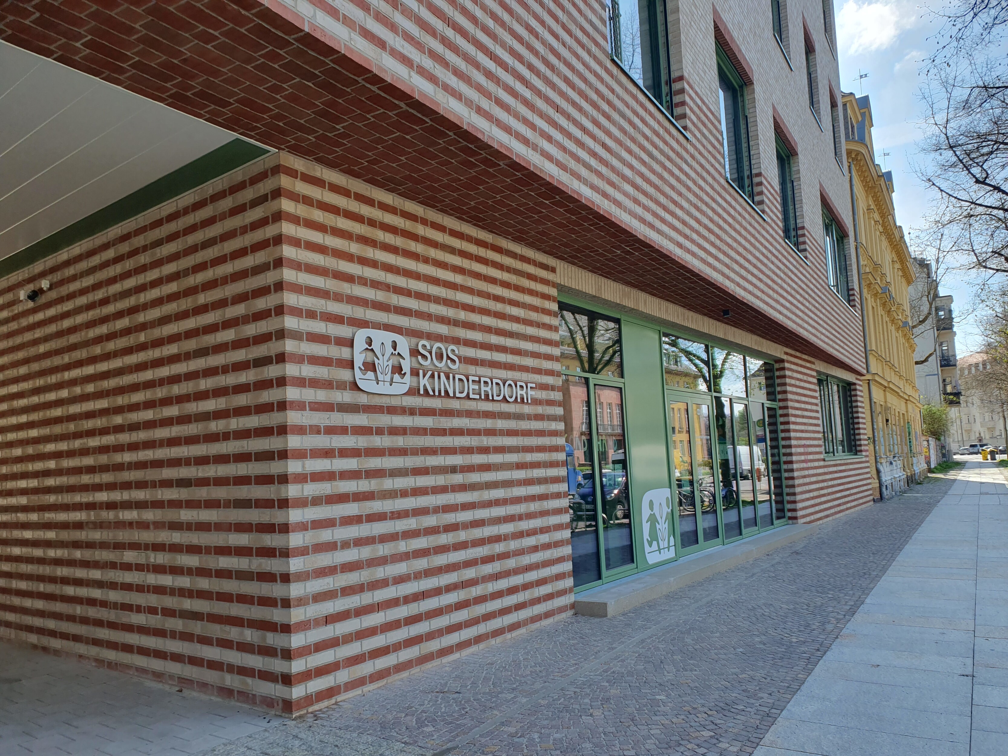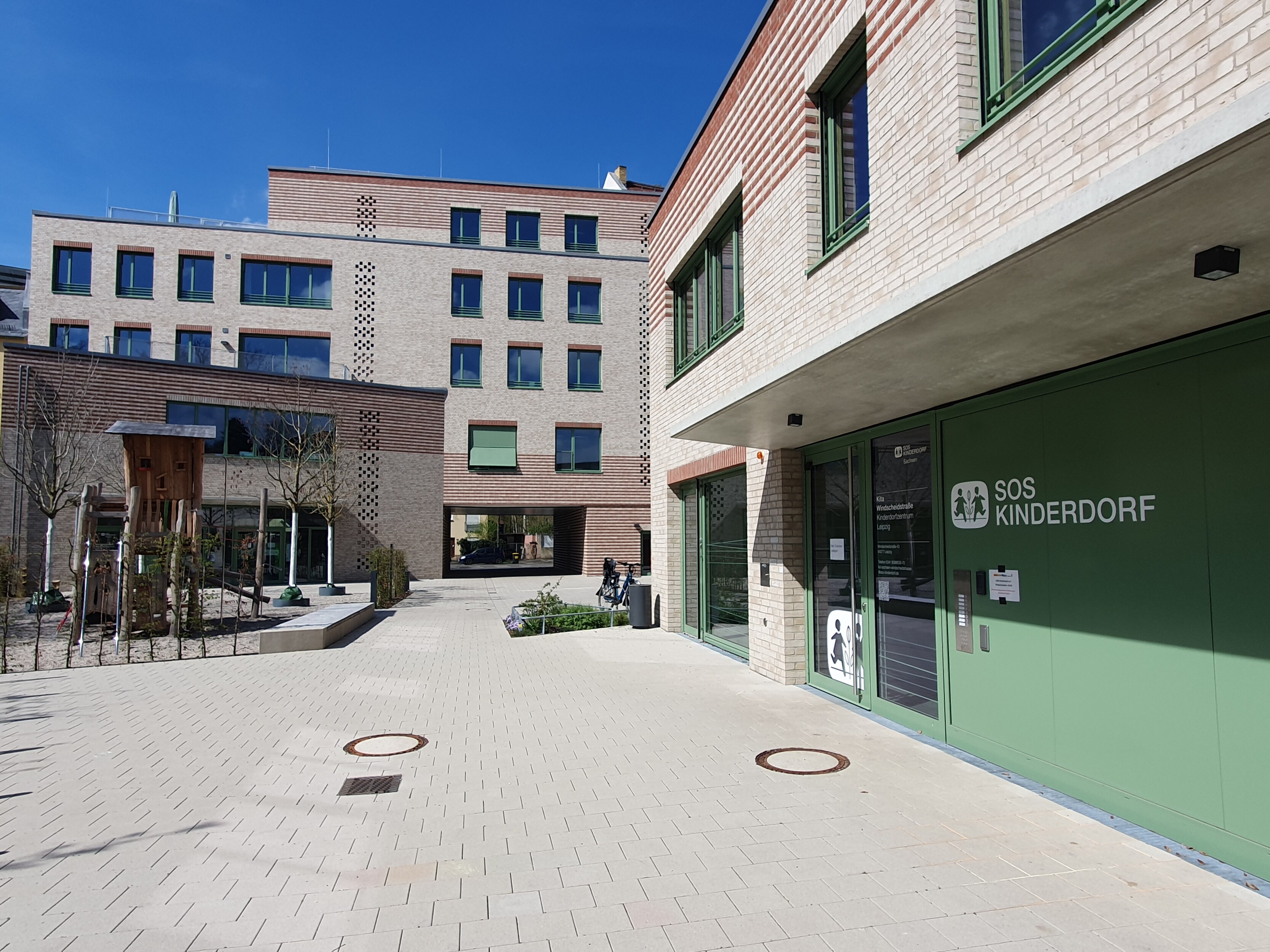 Das SOS Kinderdorf baut auf einer Brachfläche neben dem Werk II in Leipzig Connewitz ein neues Kinderdorfzentrum. Im Vorderhaus an der Windscheidstraße entsteht eine Begegnungs- und Beherbergungsstätte für Kinder, ein Café und Büroflächen. Zwei Spannbetonbinder über der Durchfahrt trragen die aufgehenden 4 Geschosse und ermöglichen so eine breite Durchfahrt für die Feuerwehr, vornehmlich jedoch für den sich öffnenden Zugang in einen geräumigen Innenhof. Hier, im rückwärtigen Bereich des langgestreckten Grundstückes, ist die geplante zweigeschossige Kindertagesstätte bereits fertiggestellt. Die Räumlichkeiten des Vorderhauses, z.B. das Cafe und erste Wohngruppen, gehen in den nächsten Wochen schrittweise in Nutzung.