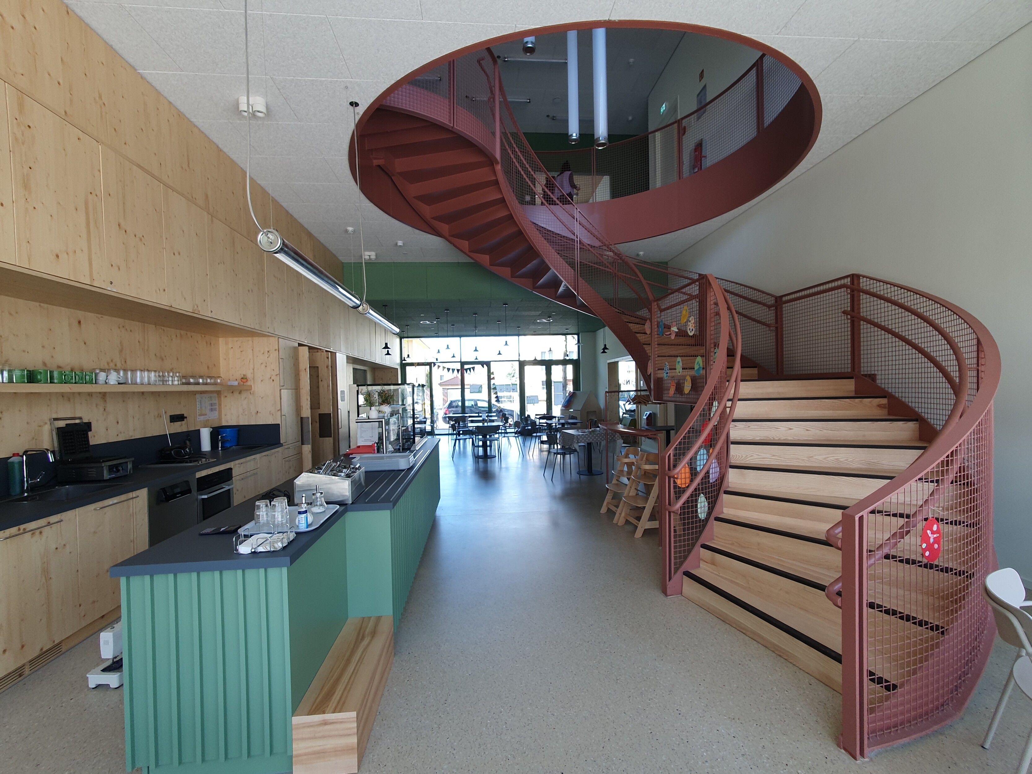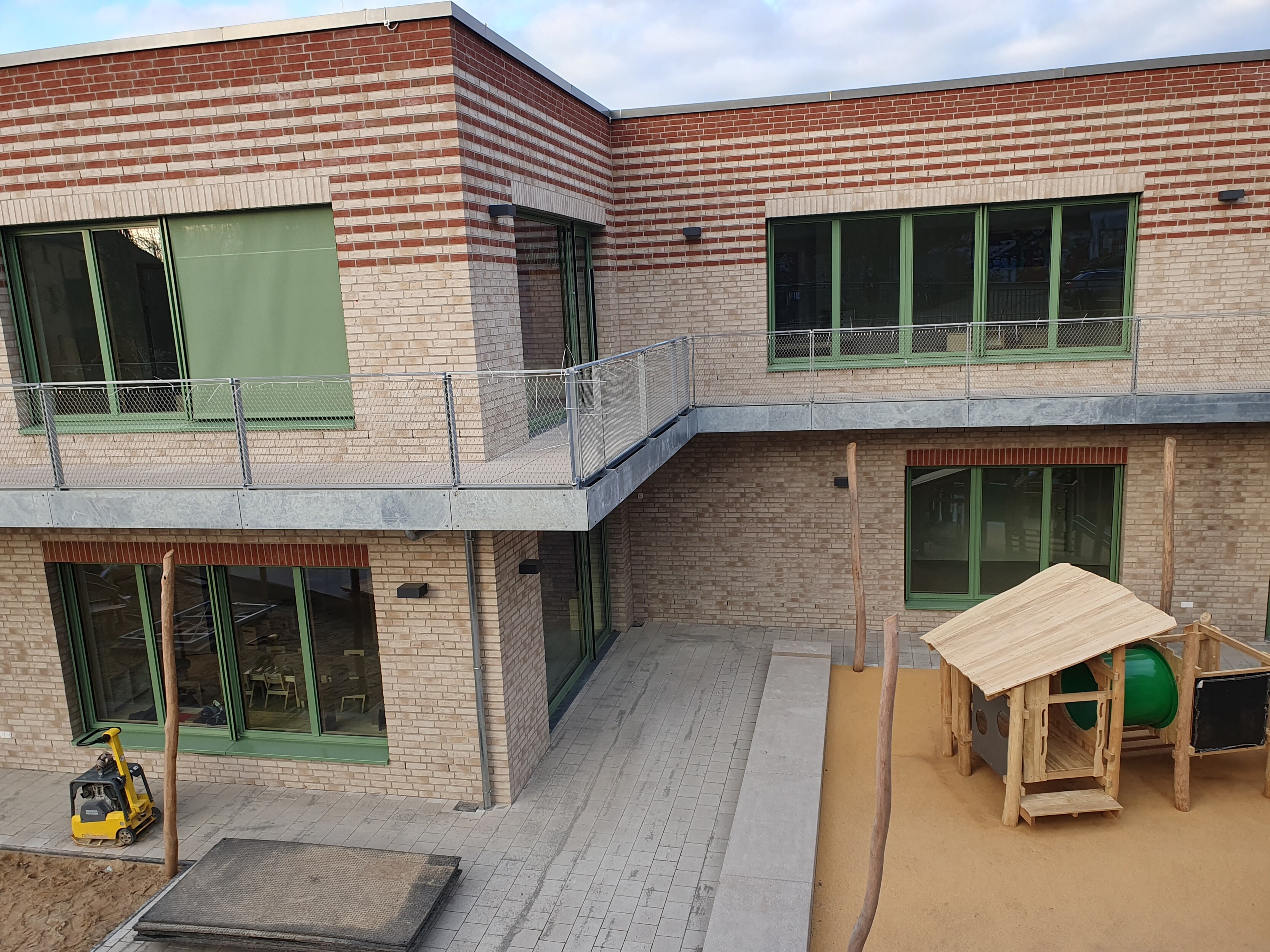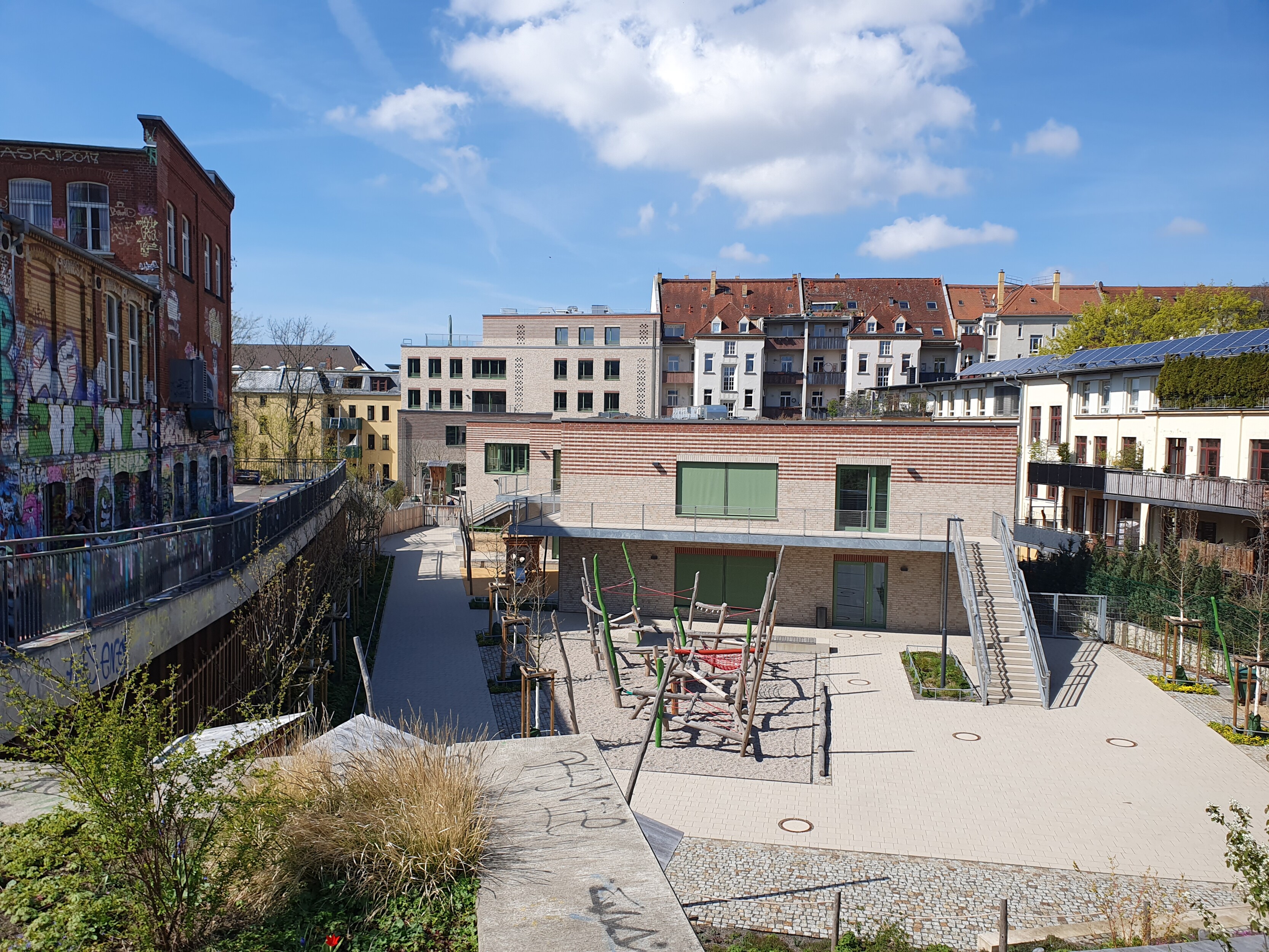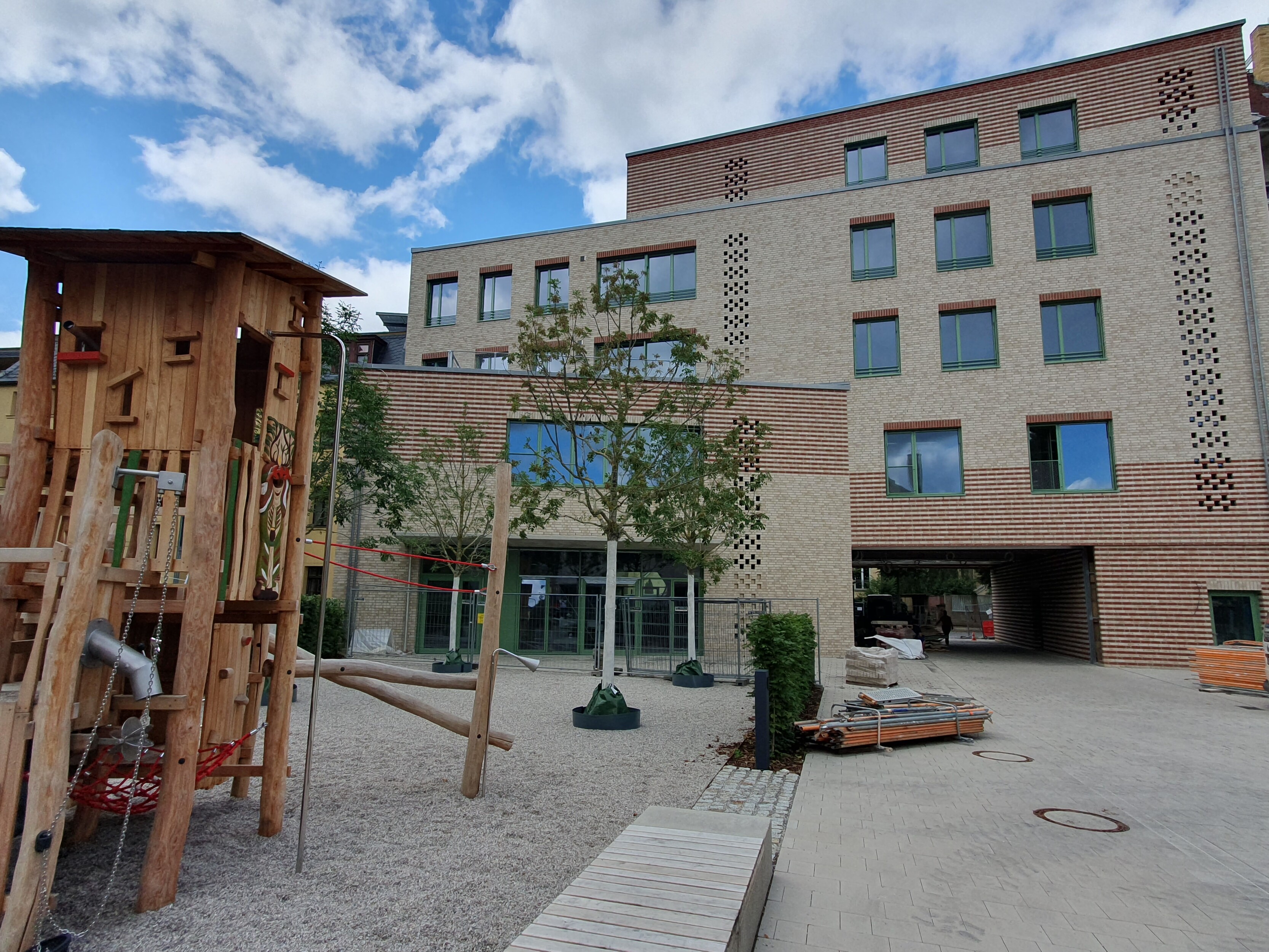 Das SOS Kinderdorf baut auf einer Brachfläche neben dem Werk II in Leipzig Connewitz ein neues Kinderdorfzentrum. Im Vorderhaus an der Windscheidstraße entsteht eine Begegnungs- und Beherbergungsstätte für Kinder, ein Café und Büroflächen. Zwei Spannbetonbinder über der Durchfahrt trragen die aufgehenden 4 Geschosse und ermöglichen so eine breite Durchfahrt für die Feuerwehr, vornehmlich jedoch für den sich öffnenden Zugang in einen geräumigen Innenhof. Hier, im rückwärtigen Bereich des langgestreckten Grundstückes, ist die geplante zweigeschossige Kindertagesstätte bereits fertiggestellt. Die Räumlichkeiten des Vorderhauses, z.B. das Cafe und erste Wohngruppen, gehen in den nächsten Wochen schrittweise in Nutzung.