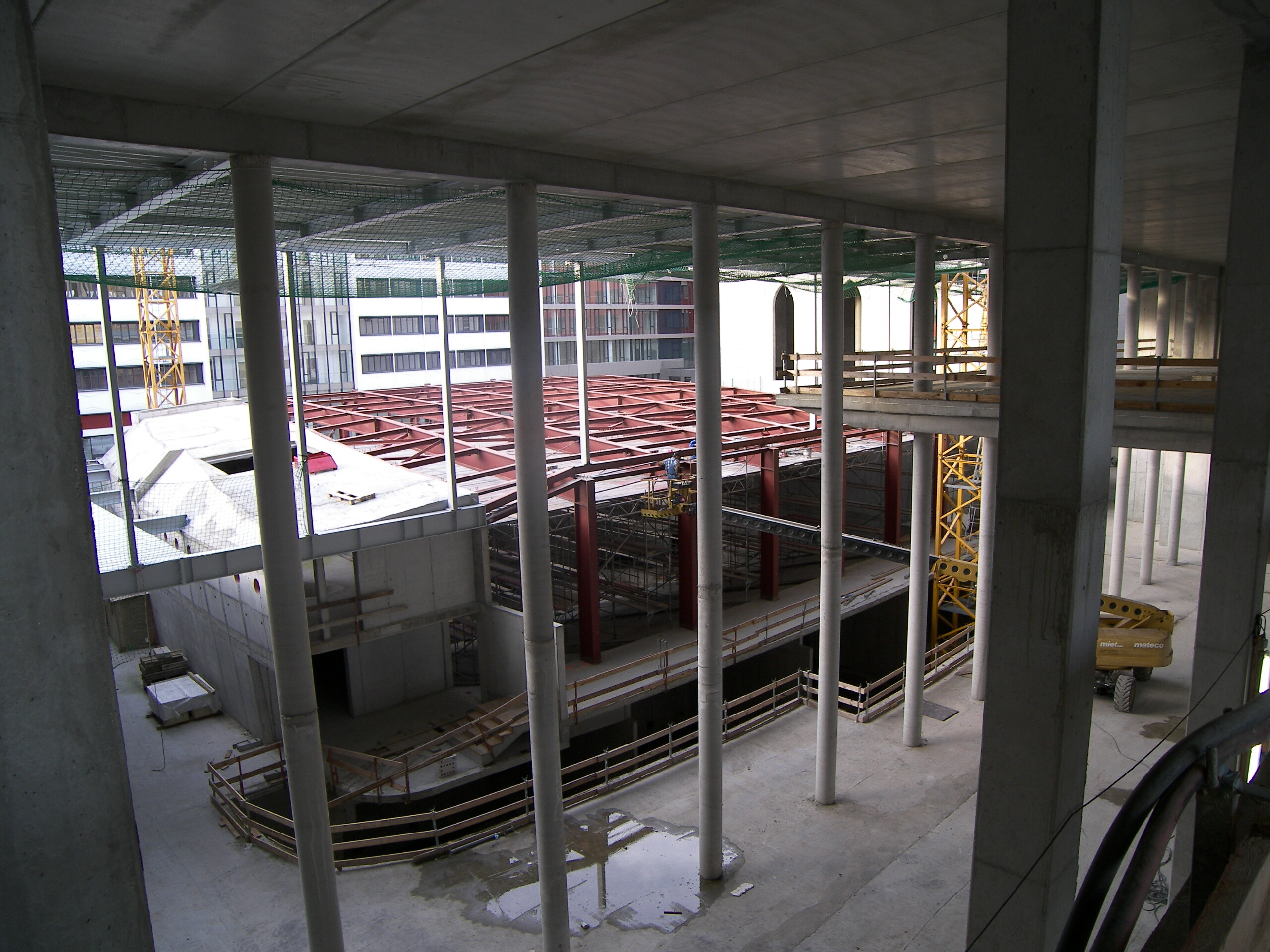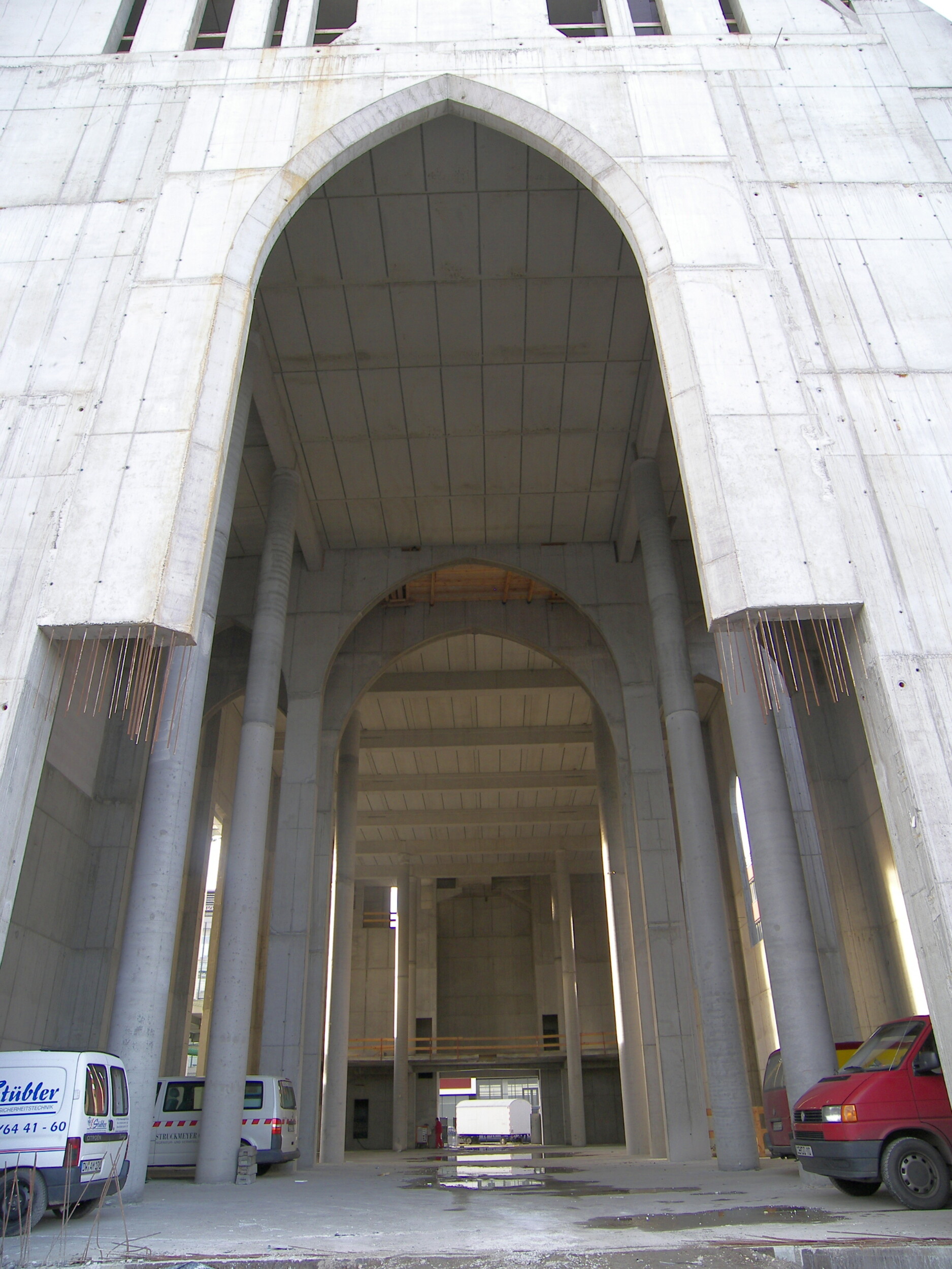 Aufgabe der Tragwerksplanung war es trotz des Wegfalls dieser zentralen Stützen eine ausgewogene Tragkonstruktion zu entwerfen. Dies wurde letztendlich mit einer Mischkonstruktion aus Stahlbetonwandscheiben und Unterzügen aus Spannbeton gelöst.